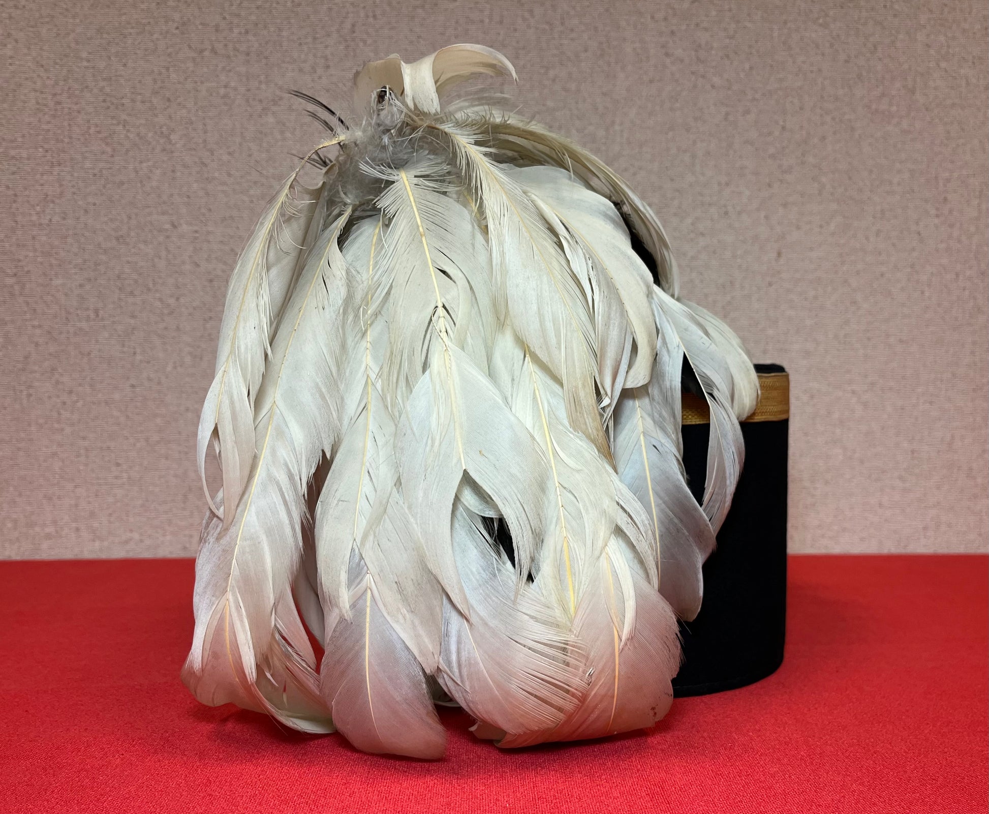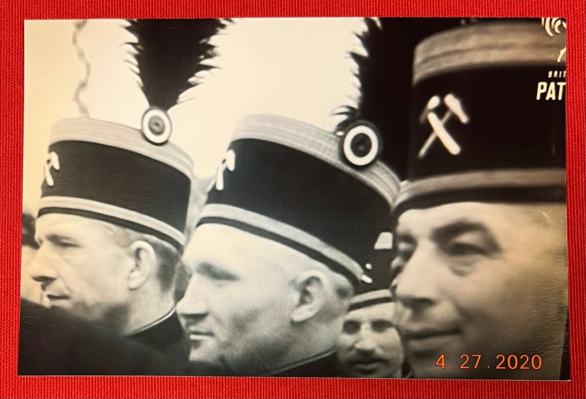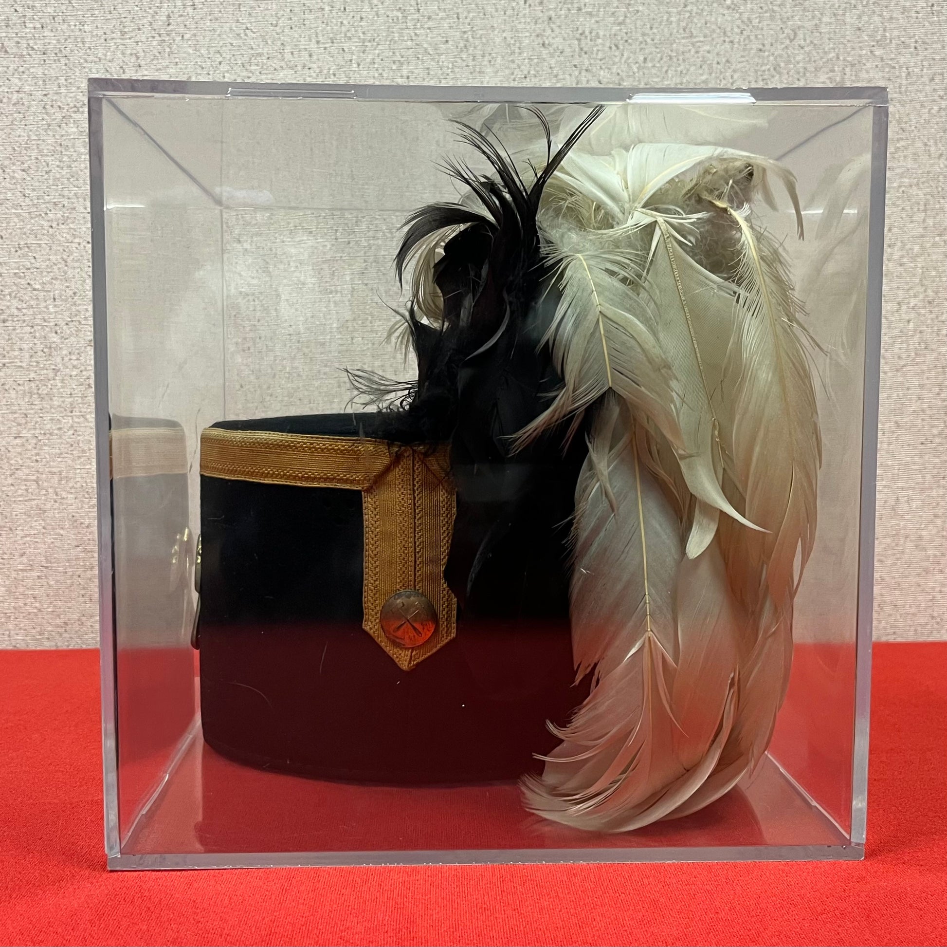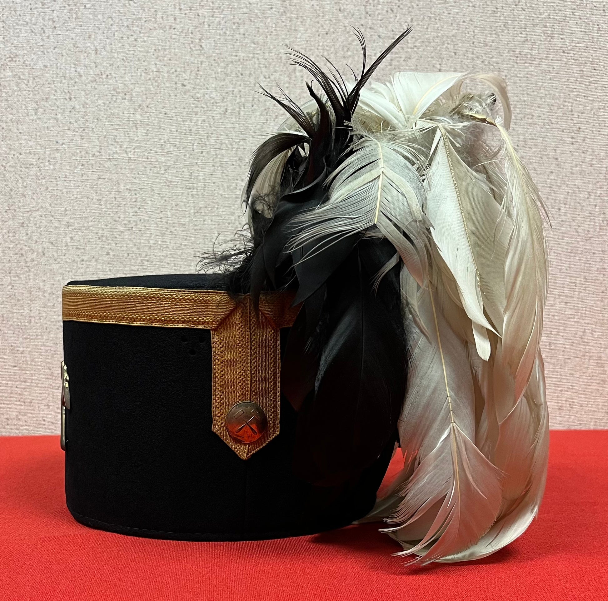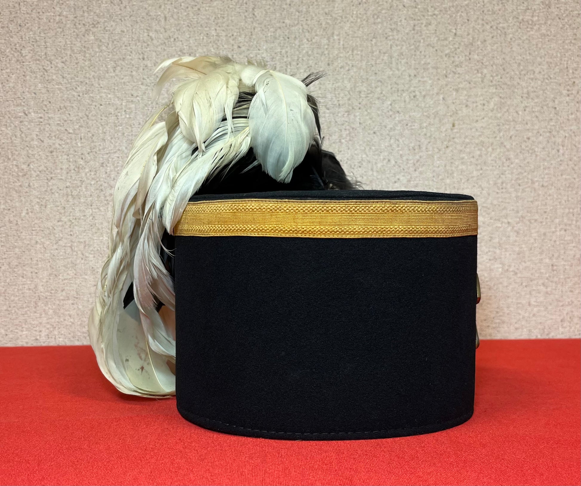 THIS BEAUTIFUL WWI ERA (1914-1918) GERMAN MINERS PARADE HAT IS WITHOUT A DOUBT ONE OF THE MOST DIFFICULT ITEMS TO FIND. FANTASTIC CONDITION, ORIGINAL BLACK & WHITE FEATHERS STILL ATTACHED. MAKER MARKED ON THE INSIDE…CARL HENKEL / BIELEFELD, GERMANY / SIZE 56 / THE PRUSSIAN COAL MINERS LOGO (CROSSED HAMMERS) IS EMBOSSED ABOVE THE MAKERS NAME / COMES WITH DISPLAY CASE