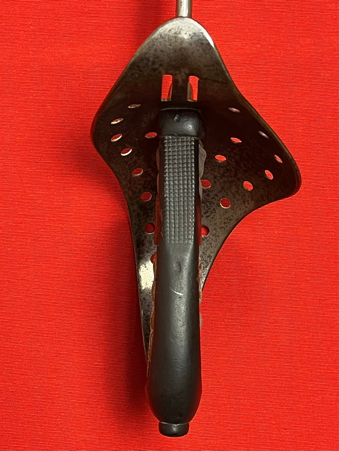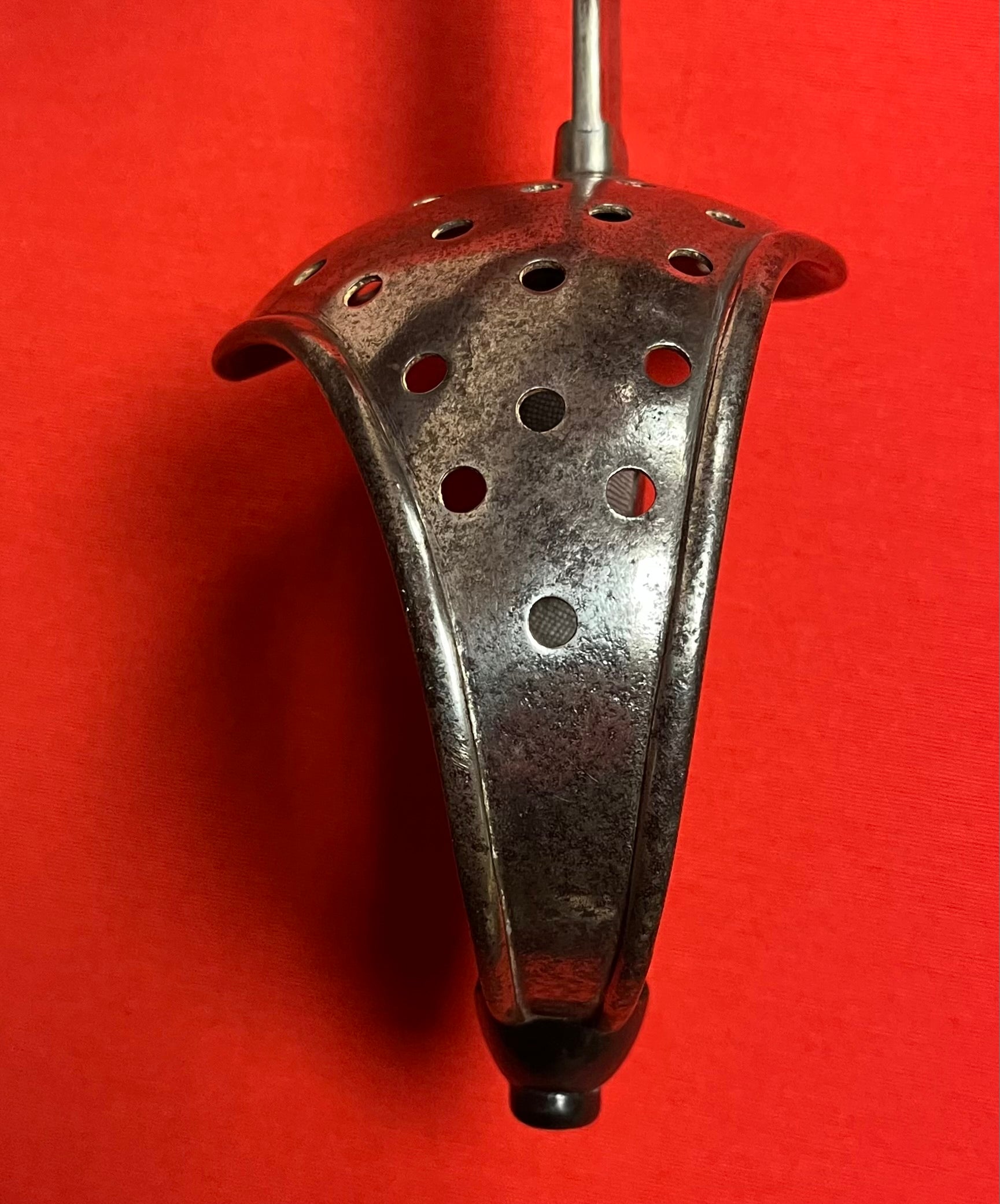 The grip material is a ray skin rather than sharkskin shagreen. The edges of the guard are turned over to protect the wearer's uniform from chafing, and two narrow elongated oval slots are formed, side-by-side, in the upper guard, above the blade.