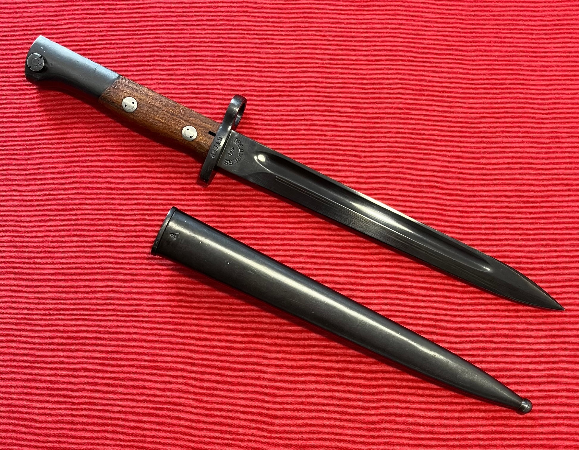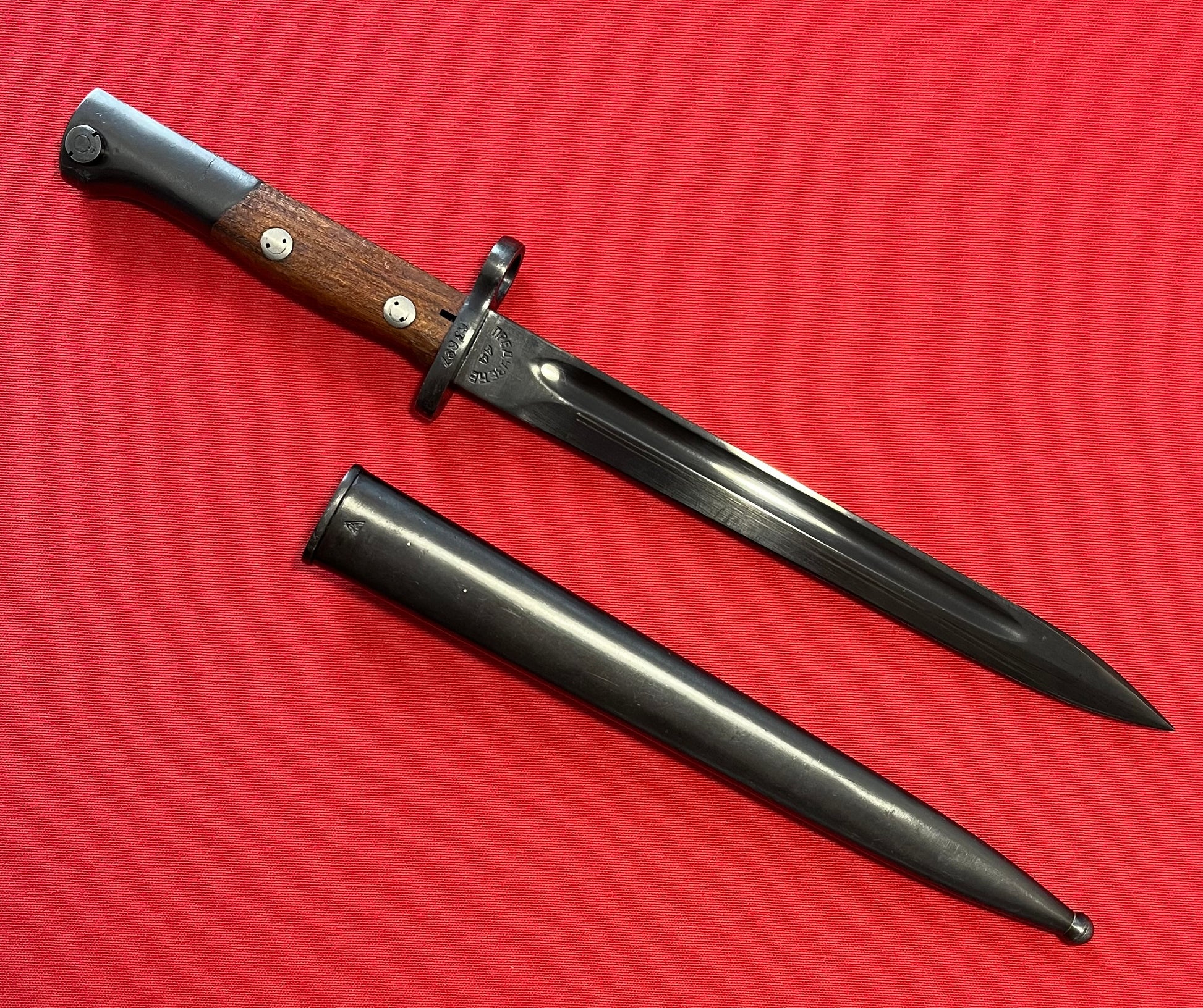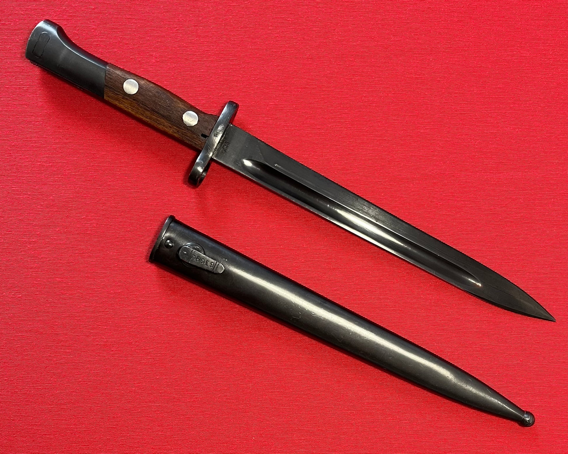 Appears to be unissued / Very clean with minimal wear / Number 63692 on cross guard / Size- 15 Inches overall with a 9 3/4 inch blade / Blade is parkerized with number 44 on the ricasso / Comes with frog attached